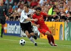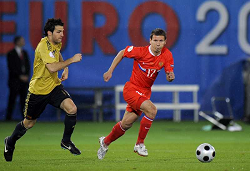 Evento: Campionati europei euro 2008 semi finale spagna-russia; Argomento: Calcio; Periodo: 2007/08; Categoria: RUSSIA - SPAGNA; Soggetto: KONSTANTIN ZYRYANOV CESC FABREGAS; Nazione: RUSSIA - SPAGNA; Descrizione: AZIONE CONTRASTO; Luogo: STADIO;