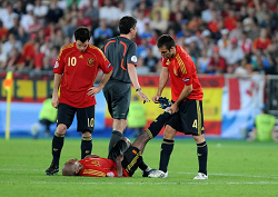 Evento: Campionati europei 2008 italia-spagna 2-4 dopo i rigori; Argomento: Calcio; Periodo: 2007/08; Categoria: SPAGNA; Soggetto: CESC FABREGAS E CARLOS MARCHENA AIUTANO MARCOS SENNA COLPITO DA CRAMPI; Nazione: SPAGNA; Descrizione: AZIONE; Luogo: STADIO; Città: VIENNA;