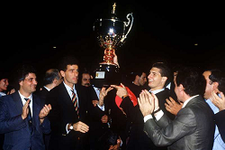 Evento: Stagione 1986-87 mundialito per club 1987 milan-barcellona 1-0; Argomento: Calcio; Periodo: 1986/87; Categoria: MILAN; Soggetto: PREMIAZIONE MAURO TASSOTTI E DANIELE MASSARO; Descrizione: CON COPPA; Luogo: STADIO; Città: MILANO;