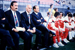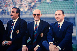 Evento: Stagione 1989-90 monza-milan 1-1 amichevole; Argomento: Calcio; Periodo: 1989/90; Categoria: MILAN; Soggetto: SILVANO RAMACCIONI, ARRIGO SACCHI, PRESIDENTE SILVIO BERLUSCONI IN PANCHINA; Descrizione: BORGHESE PRIMO PIANO; Luogo: STADIO; Città: MONZA;