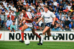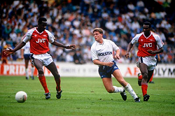 Evento: Torneo di wembley arsenal-tottenham hotspur 4-0; Argomento: Calcio; Periodo: 1988/89; Categoria: TOTTENHAM HOTSPUR - ARSENAL; Soggetto: PAUL GASCOIGNE, TOTTENHAM HOTSPUR, DAVID O'LEARY, ARSENAL, Wembley's Tournament, Arsenal vs Tottenham Hotspur 4-0, Wembley, London; Nazione: Studio Buzzi; Descrizione: AZIONE CONTRASTO; Luogo: STADIO; Città: LONDRA;