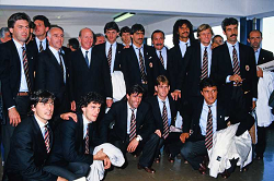 Evento: 1987-88 amichevole manchester utd-milan 2-3; Argomento: Calcio; Periodo: 1987/88; Categoria: MILAN - MANCHESTER UTD; Soggetto: SQUADRA, Team Group, CARLO ANCELOTTI, ARRIGO SACCHI, BOBBYCHARLTON, PAOLO MALDINI, MARCO VAN BASTEN, GIULIO NUCIARI, SILVANO RAMACCIONI, RUUD GULLIT, ANGELO COLOMBO, PIETRO PAOLO VIRDIS, VINCENZO PINCOLINI, WALTER BIANCHI, ROBERTO DONADONI, ALBERIGO EVANI, ROBERTO MUSSI; Nazione: Studio Buzzi; Descrizione: POSA; Luogo: INTERNO; Città: MANCHESTER;