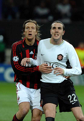 Evento: Champions league 2006/07 milan-manchester utd 3-0; Argomento: Calcio; Periodo: 2006/07; Categoria: MILAN MANCHESTER UTD; Soggetto: MASSIMO AMBROSINI - JOHN O'SHEA; Nazione: ITALIA IRLANDA; Descrizione: CONTRASTO; Luogo: STADIO; Città: MILANO;