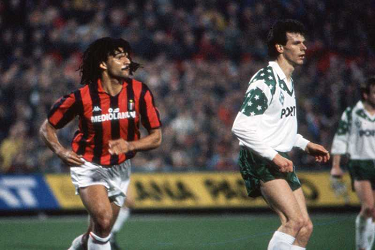 RUUD GULLIT, Milan, RUNE BRATSETH, Werder Brema, Coppa dei Campioni, European Cup, 1988-89, Milan vs Werder Bremen 1-0, 15-03-1989, Azione, Action, Single shot, Contrasto, Close up