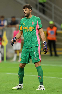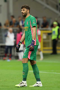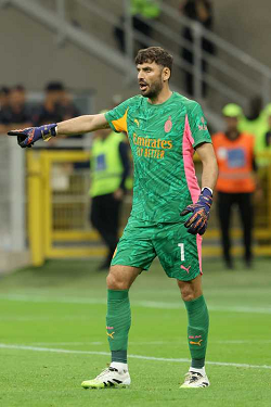 LUKASZ SKORUPSKI, Bologna, MATTEO GABBIA, Milan, Serie A, 2025-26, Milan vs Bologna 1-0, 14-09-2025, Contrasto, Action