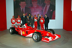 Evento: Presentazione ferrari f2003-ga; Argomento: Formula 1; Periodo: 2003; Categoria: ferrari; Soggetto: massa felipebadoer lucafresco paolotodt jeanelkan johnbarberis alessandroschumacher michaelcordero di montezemolo lucabarrichello rubensladri ferrari piero; Nazione: brasileitaliagermania; Descrizione: posa; Luogo: interno;