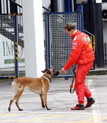 Evento: Test imola; Argomento: Formula 1; Periodo: 2004; Categoria: ferrari; Soggetto: schumacher michaelcon cane; Nazione: germania; Descrizione: borghese; Luogo: esterno;