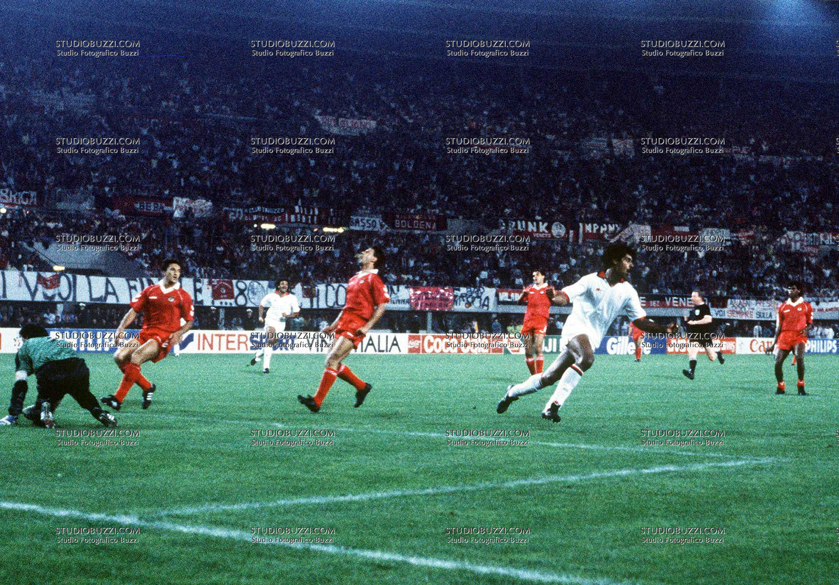 Evento: Coppa dei campioni 1989/90 finale milan-benfica 1-0; Argomento: Calcio; Periodo: 1989/90; Categoria: MILAN; Soggetto: FRANK RIJKAARD ESULTA DOPO IL GOL; Nazione: OLANDA; Descrizione: ESULTANZA GOL; Luogo: STADIO; Città: VIENNA;
