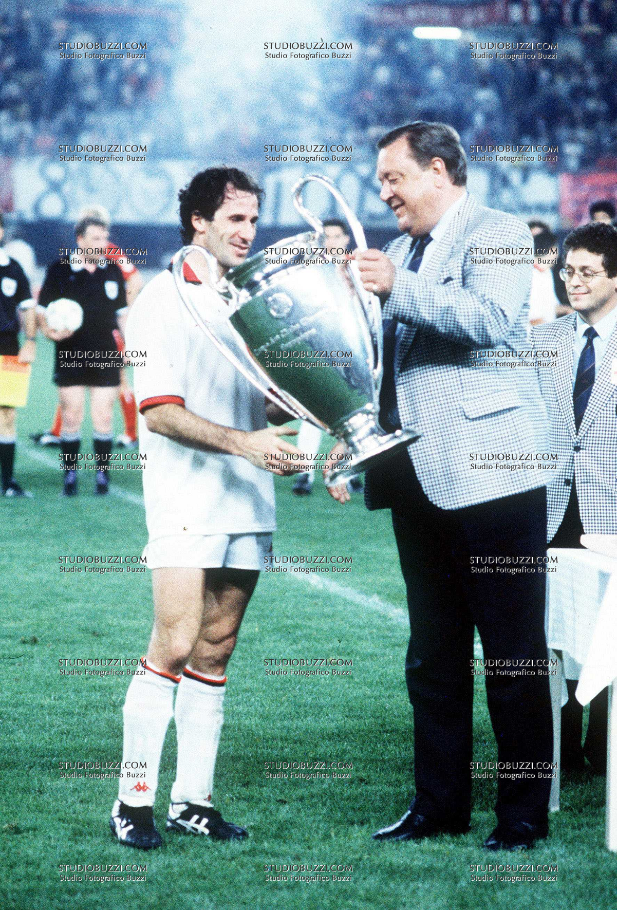Evento: Coppa dei campioni 1989/90 finale milan-benfica 1-0; Argomento: Calcio; Periodo: 1989/90; Categoria: MILAN; Soggetto: FRANCO BARESI PREMIATO DA LENNART JOHANSSON; Nazione: ITALIA SVEZIA; Descrizione: CON COPPA; Luogo: STADIO; Città: VIENNA;