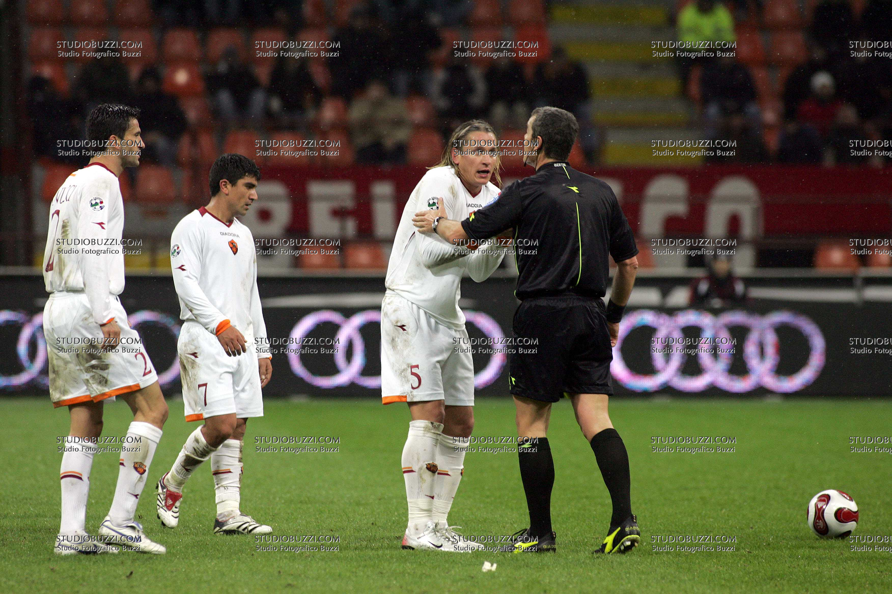 Evento: Coppa italia semi finale andata milan-roma 2-2; Argomento: Calcio; Periodo: 2006/07; Categoria: ROMA; Soggetto: SQUADRA: PHILIPPE MEXES PROTESTE; Nazione: ITALIA - FRANCIA; Descrizione: AZIONE GESTI; Luogo: STADIO;