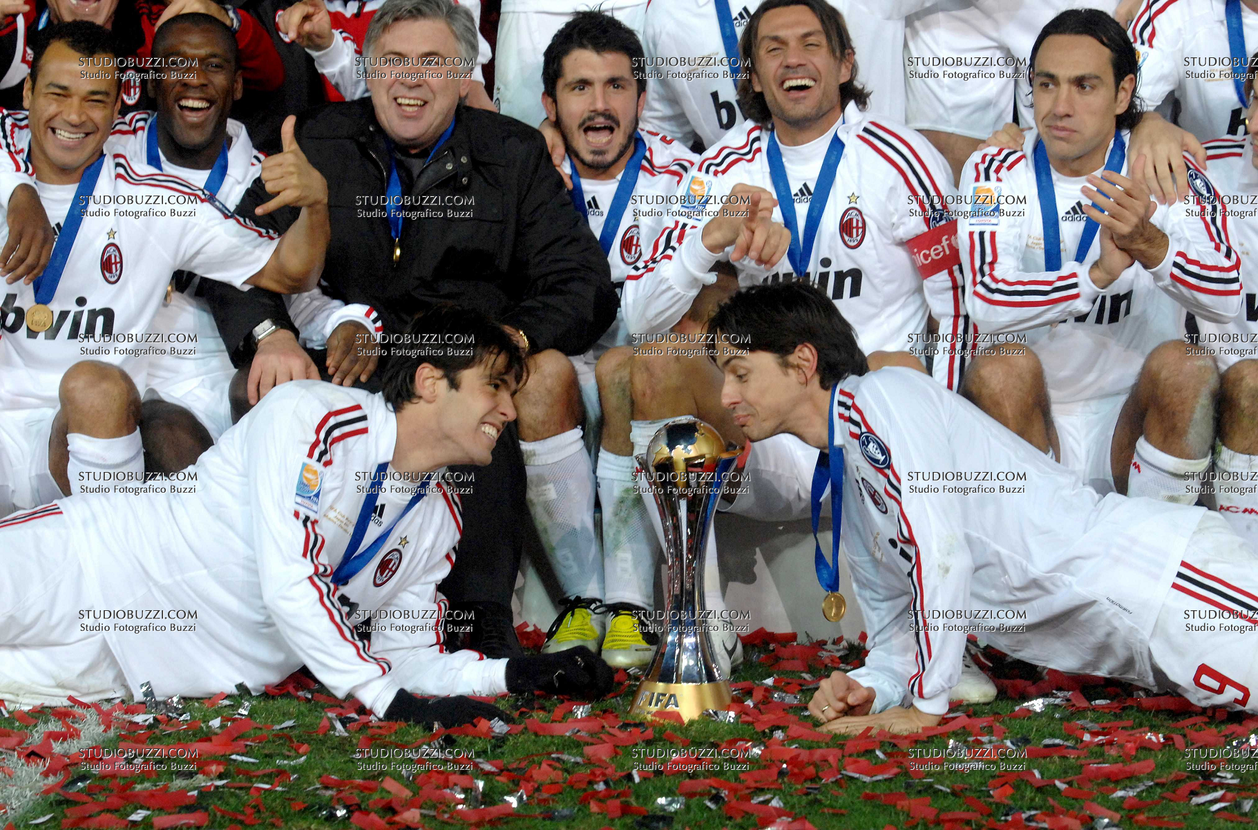 Evento: Fifa mondiale per club 2007 - finale boca juniors-milan 0-1; Argomento: Calcio; Periodo: 2007/08; Categoria: MILAN; Soggetto: SQUADRA: PAOLO MALDINI, GENNARO GATTUSO, MARCOS CAFU, KAKA', CLARENCE SEEDORF, CARLO ANCELOTTI, ALESSANDRO NESTA, FILIPPO INZAGHI.; Nazione: ITALIA; Descrizione: CON COPPA; Luogo: STADIO; Città: YOKOHAMA;