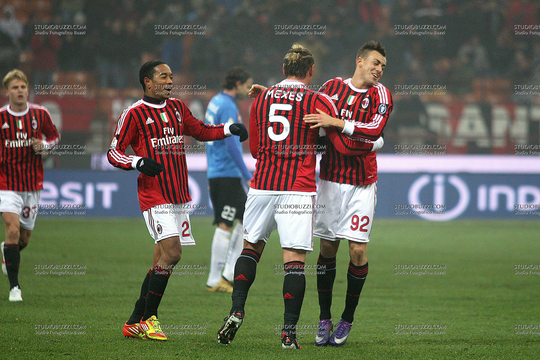 Evento: Stagione 2011-12 coppa italia ottavi di finale milan-novara 2-1; Argomento: Calcio; Periodo: 2011/12; Categoria: MILAN; Soggetto: SQUADRA: STEPHAN EL SHAARAWY URBY EMANUELSON; Nazione: ITALIA - OLANDA; Descrizione: ESULTANZA; Luogo: STADIO;