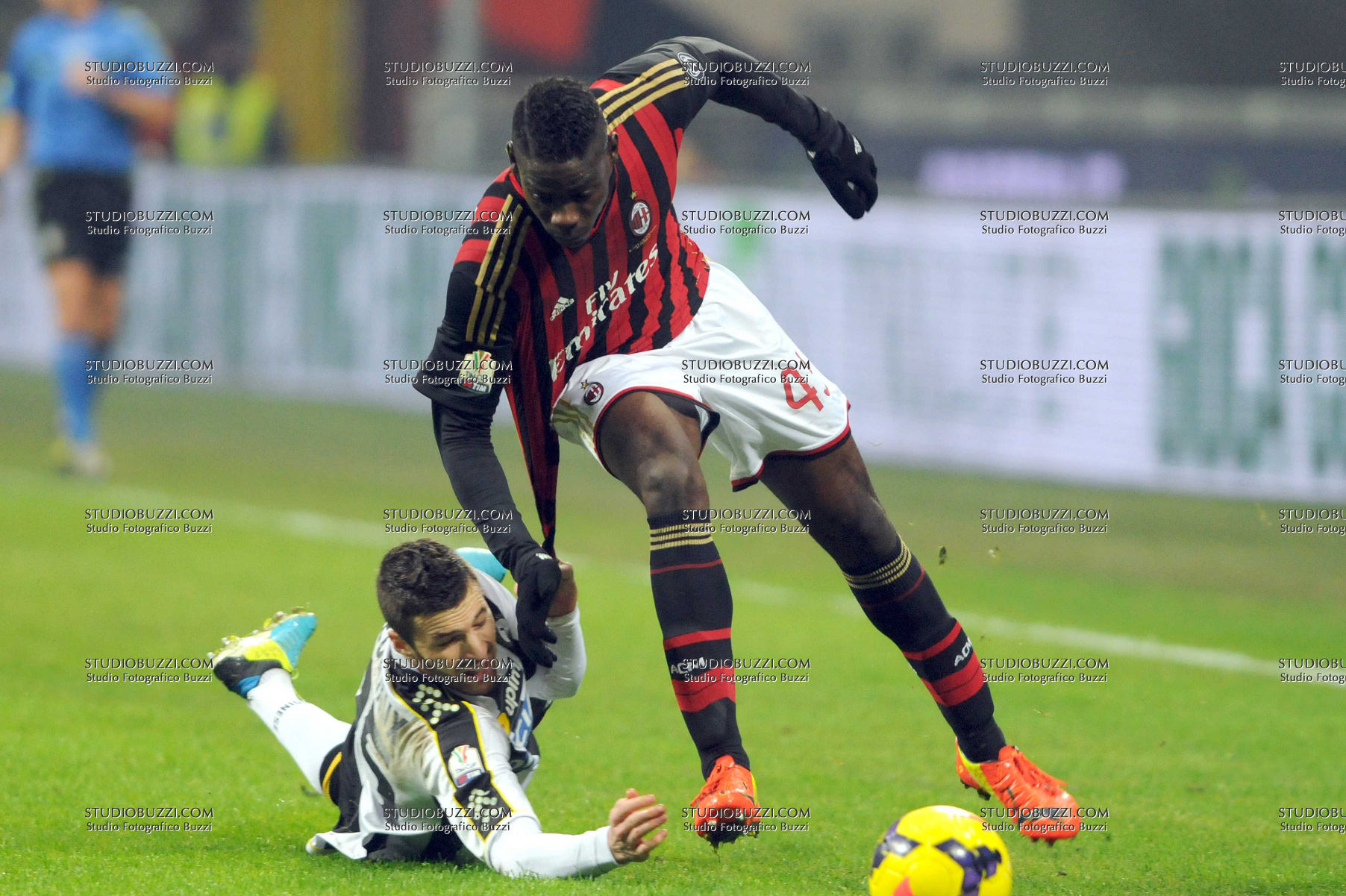 Evento: Coppa italia tim 2013-14 milan-udinese 1-2; Argomento: Calcio; Periodo: 2013/14; Categoria: MILAN - UDINESE; Soggetto: MARIO BALOTELLI, THOMAS HERTAUX, MAGLIA TIRATA; Nazione: ITALIA FRANCIA; Descrizione: CONTRASTO; Luogo: STADIO; Città: MILANO;
