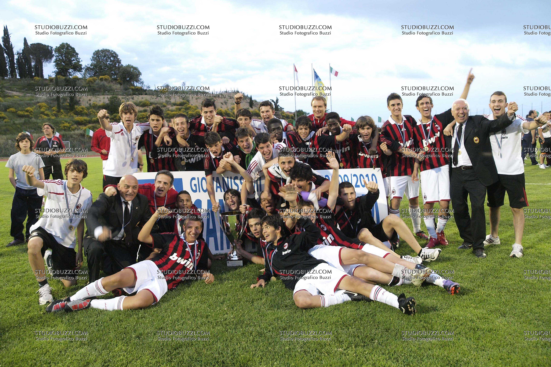 Evento: Finale campionato giovanissimi 2009/10 giovanili milan-roma; Argomento: Calcio; Periodo: 2009/10; Categoria: MILAN GIOVANISSIMI; Soggetto: squadra; Nazione: ITALIA; Descrizione: ESULTANZA CON COPPA; Luogo: STADIO;