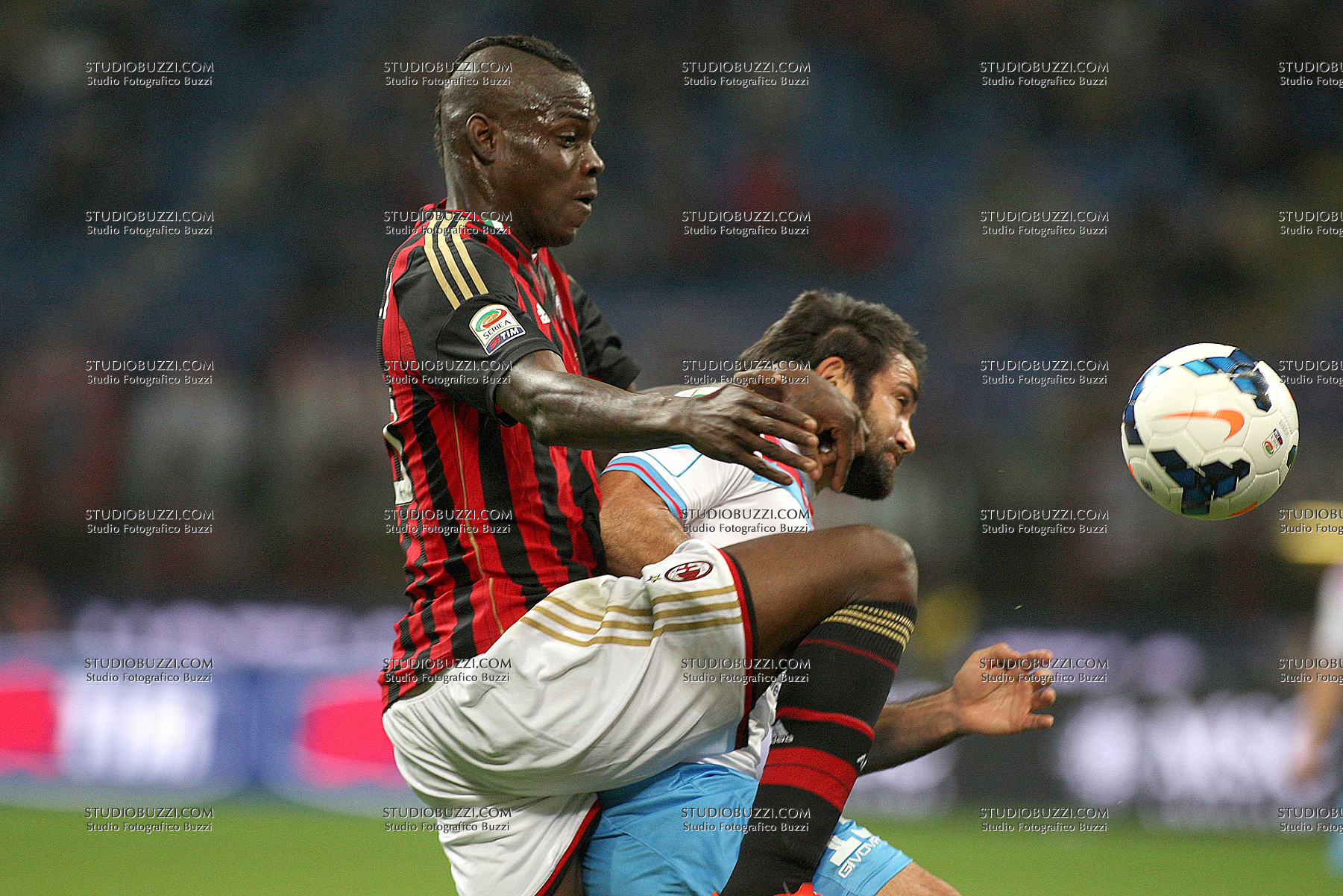 Evento: Campionato serie a 2013-14 milan-catania 1-0; Argomento: Calcio; Periodo: 2013/14; Categoria: MILAN - CATANIA; Soggetto: MARIO BALOTELLI, FABIAN ANDRES RINAUDO; Nazione: ITALIA - ARGENTINA; Descrizione: CONTRASTO; Luogo: STADIO; Città: MILANO;