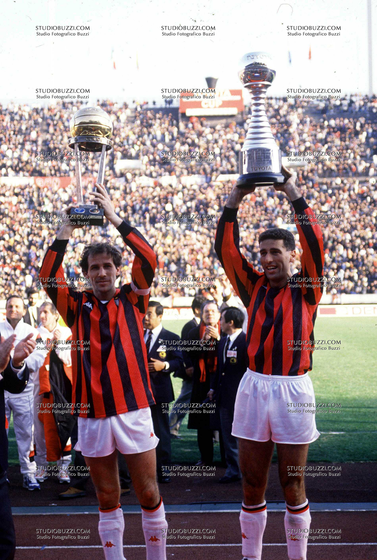 Evento: Coppa intercontinentale 1989 milan-nacional medellin; Argomento: Calcio; Periodo: 1989/90; Categoria: MILAN; Soggetto: COPPA INTERCONTINENTALE 1989 - STAGIONE 1989/90 MILAN - NACIONAL MEDELLIN FRANCO BARESI CON LA COPPA INTERCONTINENTALE E MAURO TASSOTTI CON LA TOYOTA CUP APPENA VINTE; Nazione: STUDIO BUZZI SRL; Descrizione: CON COPPA; Luogo: STADIO; Città: TOKIO;