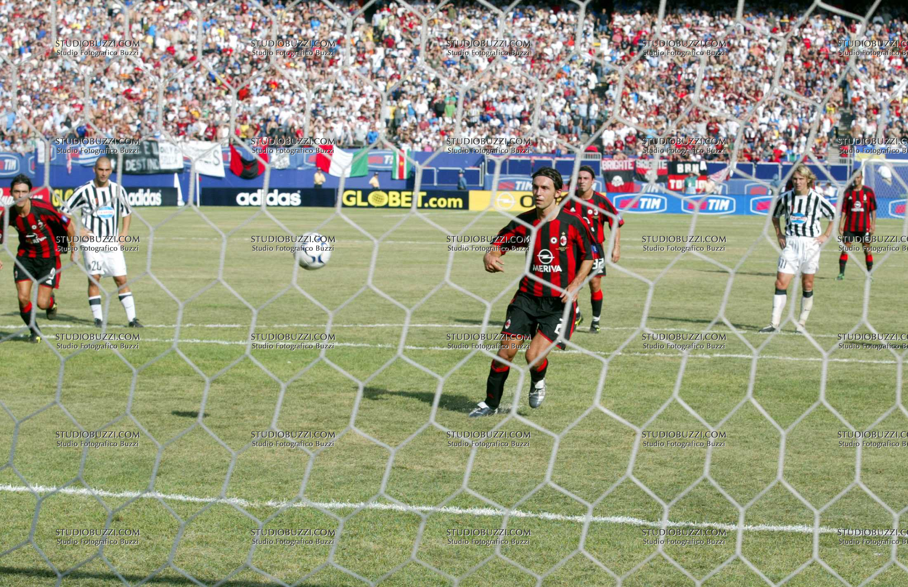 Evento: Supercoppa di lega finale juventus-milan; Argomento: Calcio; Periodo: 2003/04; Categoria: milan; Soggetto: pirlo andrea; Nazione: italia; Descrizione: gol; Luogo: stadio;