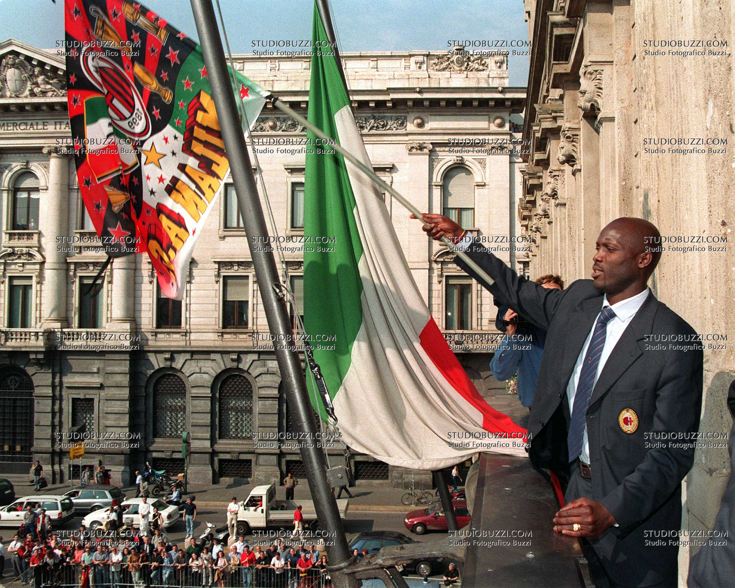 Evento: Stagione 1998-99 milan premiazione scudetto a palazzo marino; Argomento: Calcio; Periodo: 1998/99; Categoria: MILAN; Soggetto: GEORGE WEAH SALUTA I TIFOSI, BANDIERA; Descrizione: BORGHESE; Città: MILANO;