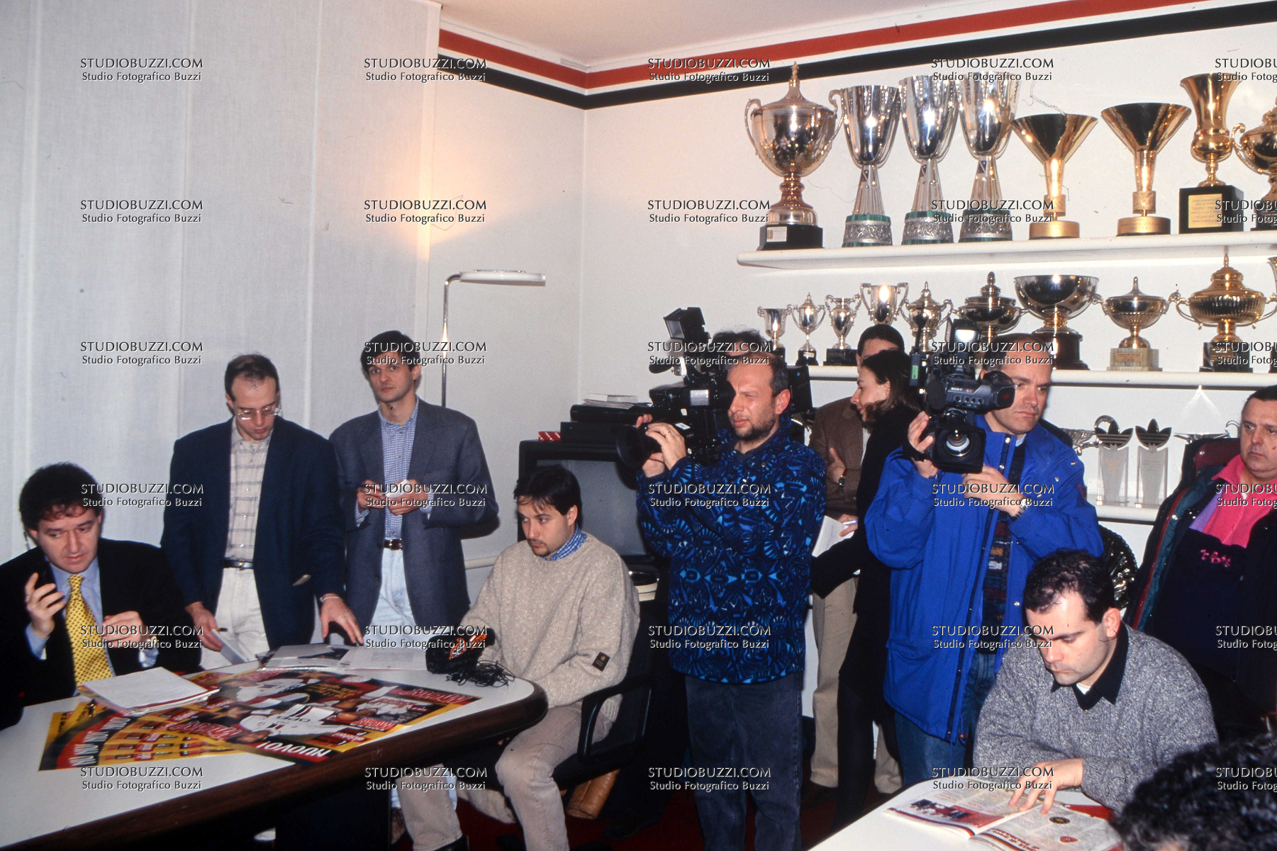 Evento: Stagione 1996-97 presentazione rivista forza milan! panini; Argomento: Calcio; Periodo: 1996/97; Categoria: MILAN - PANINI; Soggetto: GIORNALISTI CAMERAMEN, SALA COPPE; Descrizione: BORGHESE; Luogo: INTERNO; Città: MILANO;