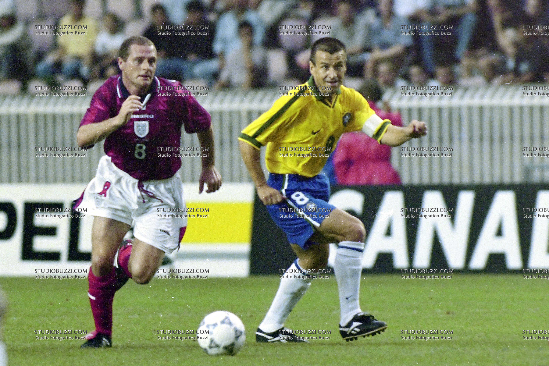 Evento: Stagione 1996-97 amichevole inghilterra-brasile 0-1; Argomento: Calcio; Periodo: 1996/97; Categoria: INGHILTERRA - BRASILE; Soggetto: Season 1996-97, Friendly Match, England-Brazil 0-1, PAUL GASCOIGNE, CARLOS DUNGA; Descrizione: AZIONE CONTRASTO; Luogo: STADIO;