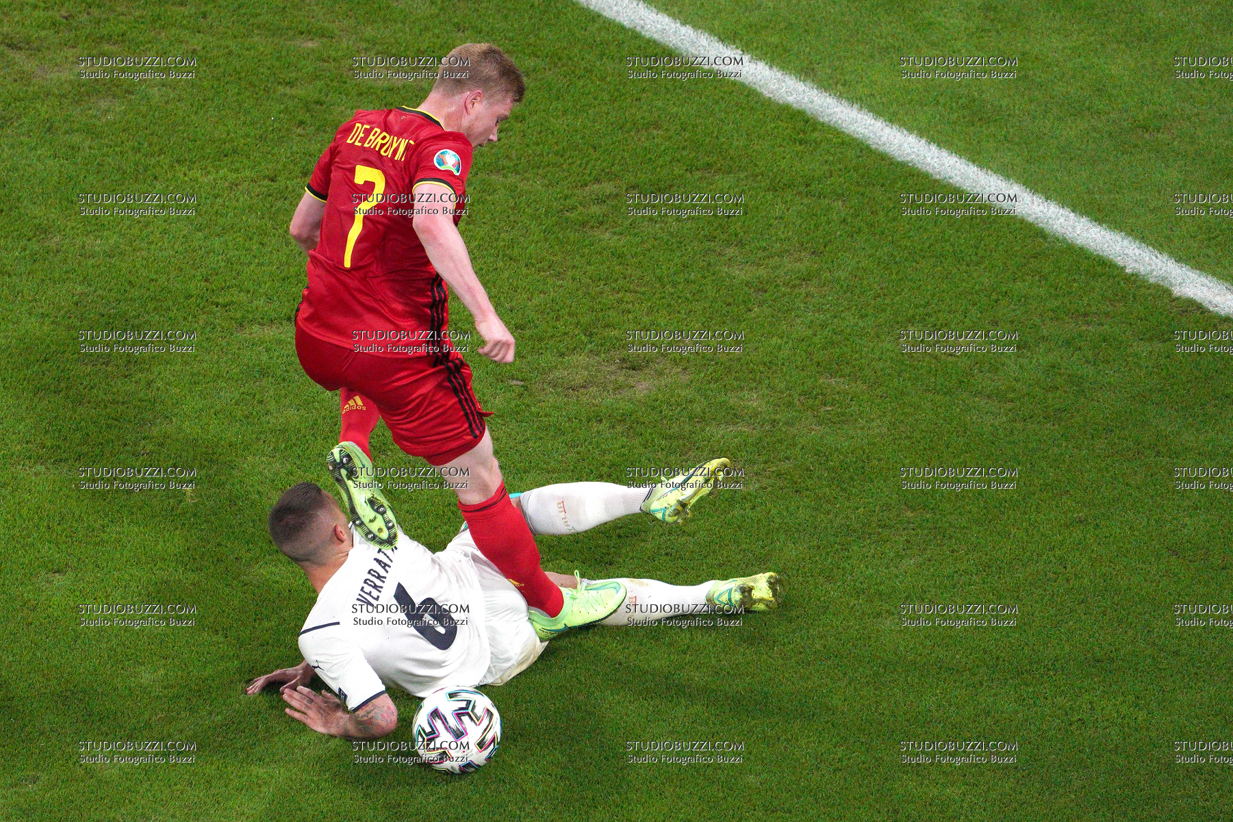 Evento: Euro 2020 quarti di finale belgio-italia 1-2; Argomento: Calcio; Periodo: 2020/21; Categoria: ITALIA ITALY BELGIUM BELGIO; Soggetto: Euro 2020, Quarter Final, Belgium Belgio-Italy Italia 1-2, KEVIN DE BRUYNE, MARCO VERRATTI; Descrizione: CONTRASTO; Luogo: STADIO; Città: MONACO DI BAVIERA;
