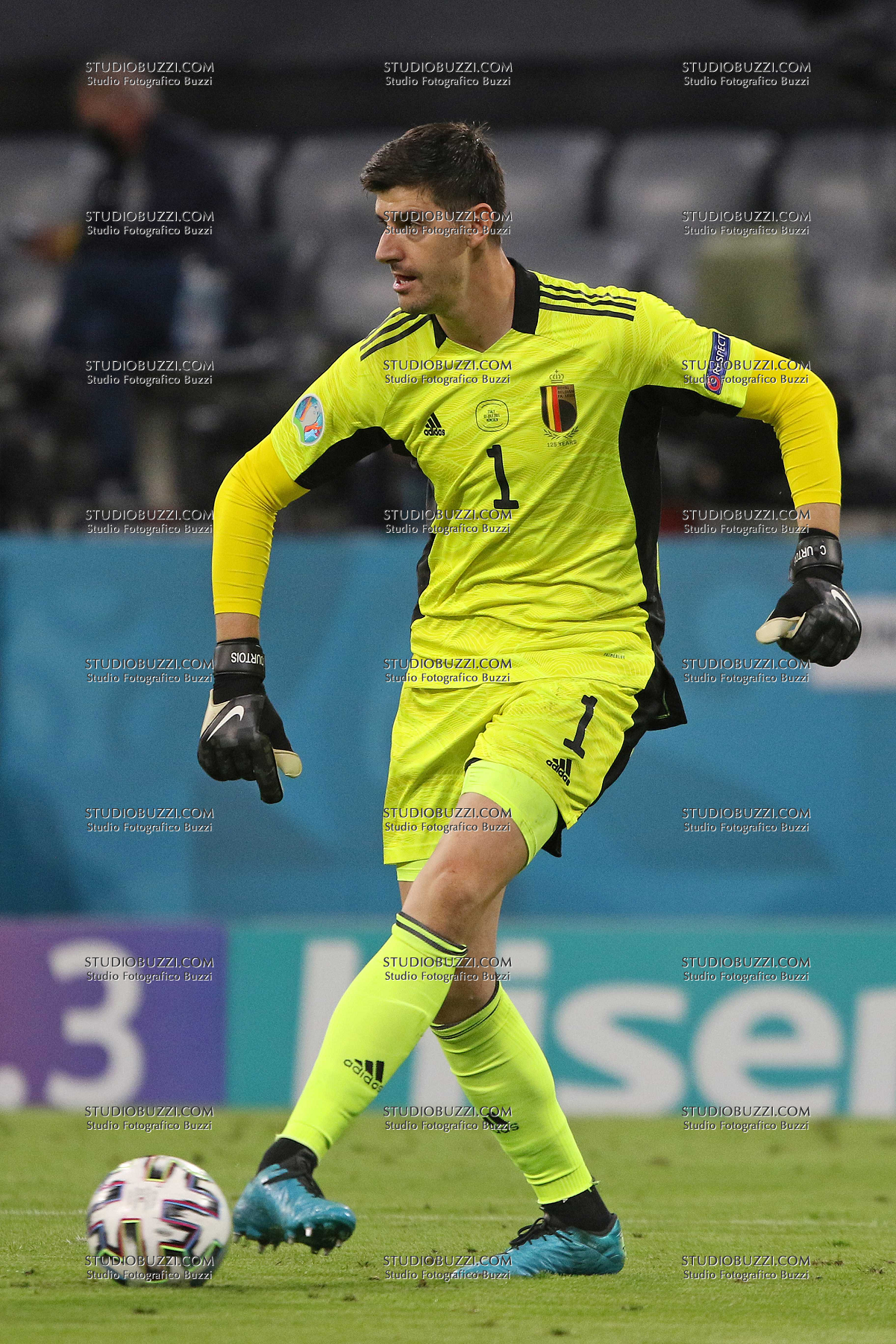 Evento: Euro 2020 quarti di finale belgio-italia 1-2; Argomento: Calcio; Periodo: 2020/21; Categoria: BELGIO; Soggetto: THIBAUT COURTOIS, Belgio, UEFA EURO 2020, Quarter Final, Belgium vs Italy 1-2, Munich; Nazione: Studio Buzzi; Descrizione: AZIONE; Luogo: STADIO; Città: MONACO DI BAVIERA;