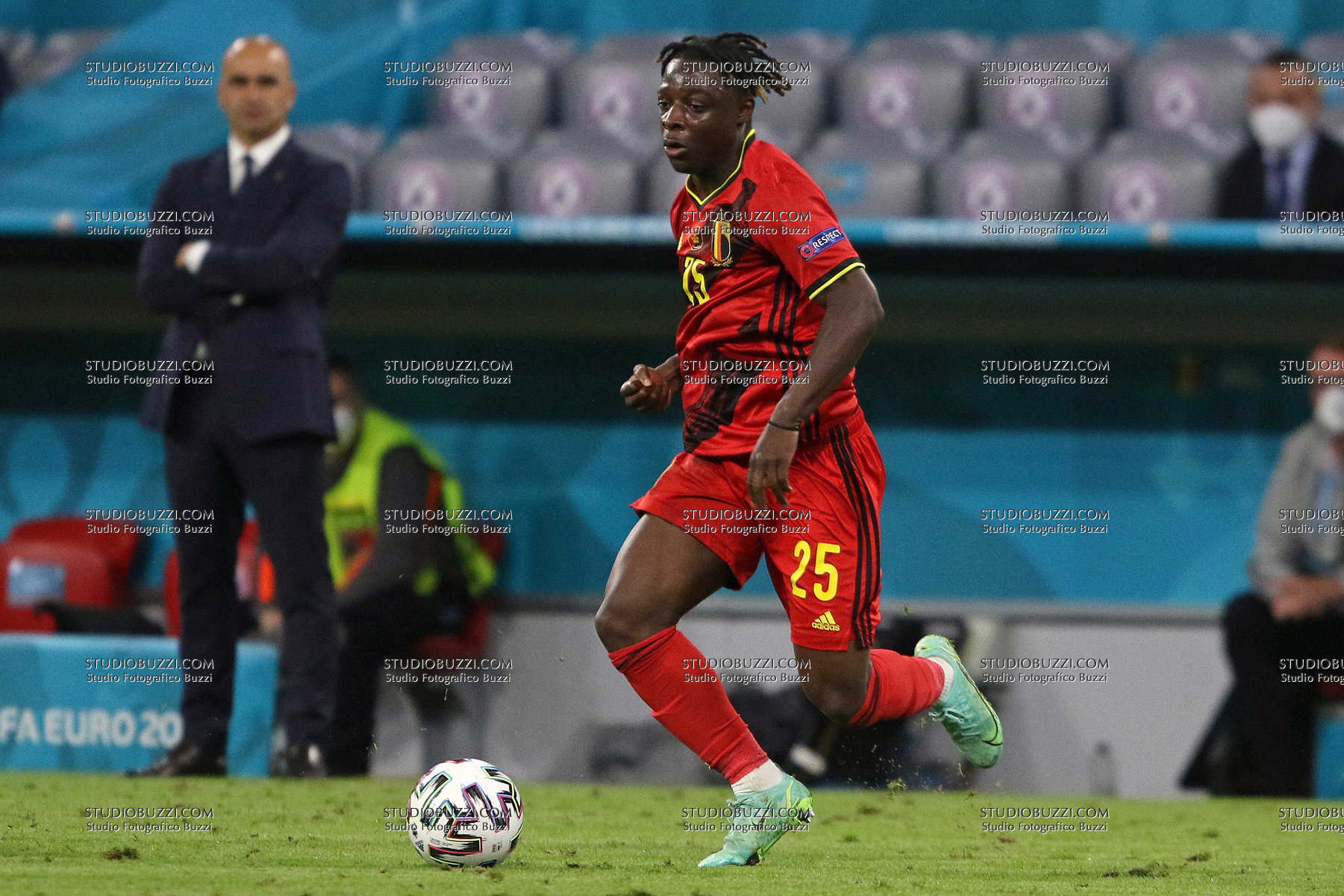 Evento: Euro 2020 quarti di finale belgio-italia 1-2; Argomento: Calcio; Periodo: 2020/21; Categoria: BELGIO; Soggetto: JEREMY DOKU, Belgio, UEFA EURO 2020, Quarter Final, Belgium vs Italy 1-2, Munich; Nazione: Studio Buzzi; Descrizione: AZIONE; Luogo: STADIO; Città: MONACO DI BAVIERA;