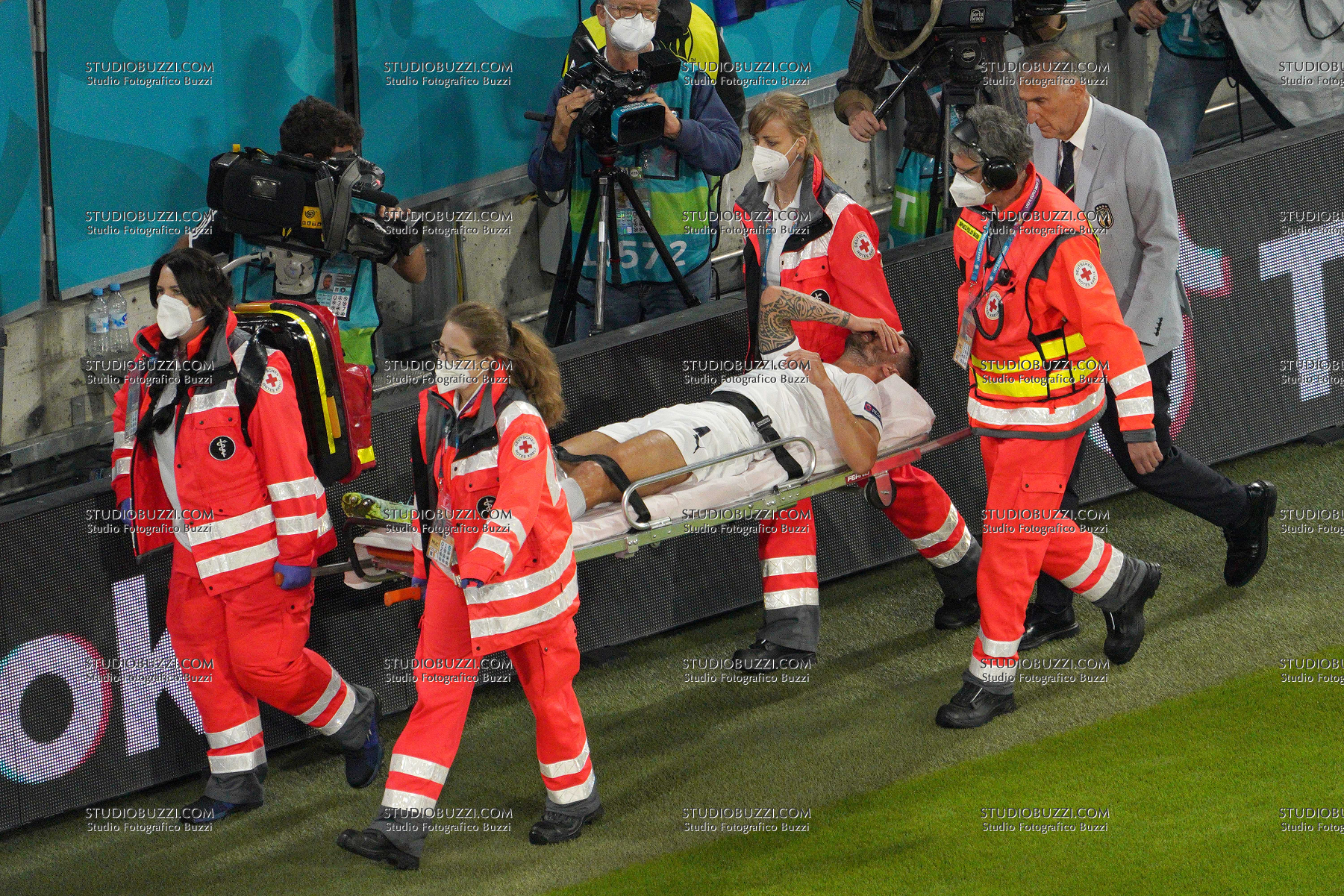 Evento: Euro 2020 quarti di finale belgio-italia 1-2; Argomento: Calcio; Periodo: 2020/21; Categoria: ITALIA ITALY; Soggetto: Euro 2020, Quarter Final, Belgium Belgio-Italy Italia 1-2, INFORTUNIO LEONARDO SPINAZZOLA INJURED; Descrizione: AZIONE; Luogo: STADIO; Città: MONACO DI BAVIERA;