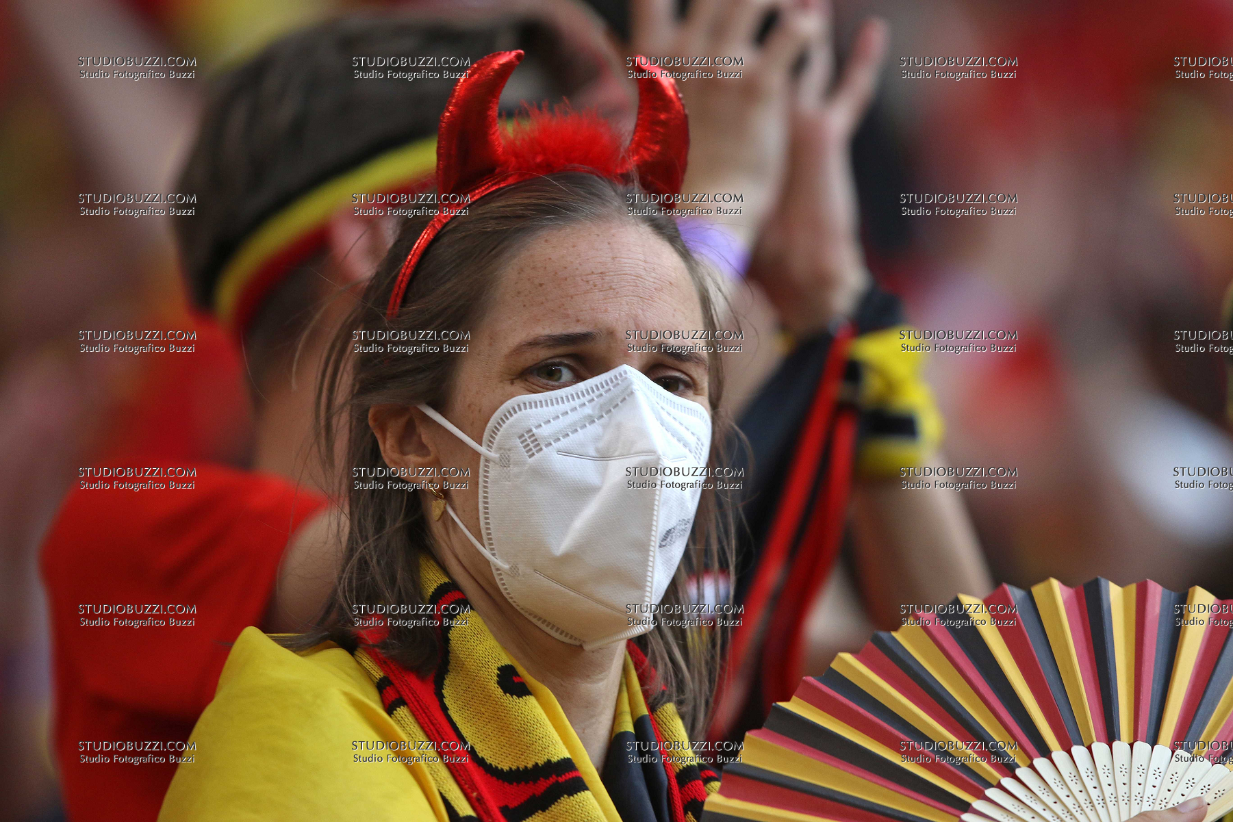 Evento: Euro 2020 quarti di finale belgio-italia 1-2; Argomento: Calcio; Periodo: 2020/21; Categoria: BELGIO; Soggetto: TIFOSI, TIFOSA, Fan, Supporter, Belgio, UEFA EURO 2020, Quarter Final, Belgium vs Italy 1-2, Munich; Nazione: Studio Buzzi; Descrizione: PRIMO PIANO; Luogo: STADIO; Città: MONACO DI BAVIERA;