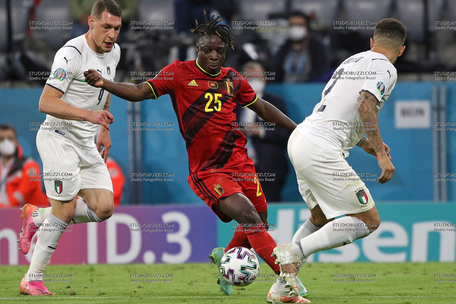 Evento: Euro 2020 quarti di finale belgio-italia 1-2; Argomento: Calcio; Periodo: 2020/21; Categoria: BELGIO; Soggetto: JEREMY DOKU, Belgio, UEFA EURO 2020, Quarter Final, Belgium vs Italy 1-2, Munich; Nazione: Studio Buzzi; Descrizione: CONTRASTO; Luogo: STADIO; Città: MONACO DI BAVIERA;