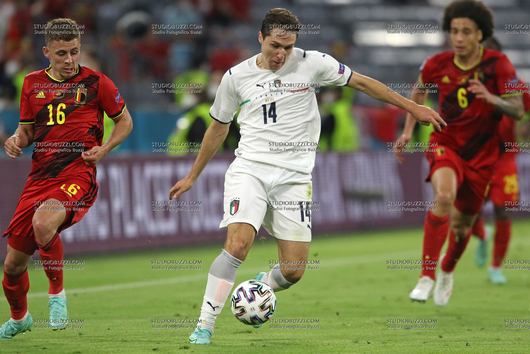 Evento: Euro 2020 quarti di finale belgio-italia 1-2; Argomento: Calcio; Periodo: 2020/21; Categoria: ITALIA - BELGIO; Soggetto: FEDERICO CHIESA, Italia, THORGAN HAZARD, Belgio, UEFA EURO 2020, Quarter Final, Belgium vs Italy 1-2, Munich; Nazione: Studio Buzzi; Descrizione: AZIONE CONTRASTO; Luogo: STADIO; Città: MONACO DI BAVIERA;