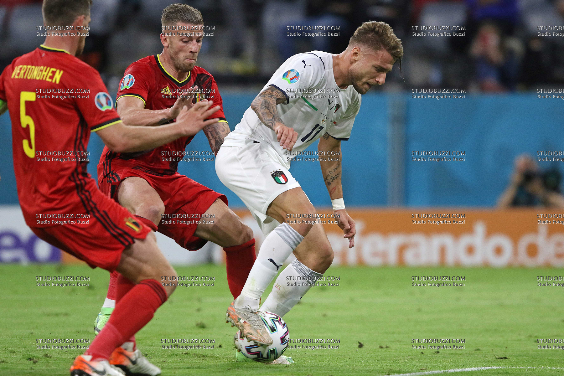 Evento: Euro 2020 quarti di finale belgio-italia 1-2; Argomento: Calcio; Periodo: 2020/21; Categoria: ITALIA - BELGIO; Soggetto: CIRO IMMOBILE, Italia, TOBY ALDERWEIRELD, Belgio, UEFA EURO 2020, Quarter Final, Belgium vs Italy 1-2, Munich; Nazione: Studio Buzzi; Descrizione: CONTRASTO; Luogo: STADIO; Città: MONACO DI BAVIERA;