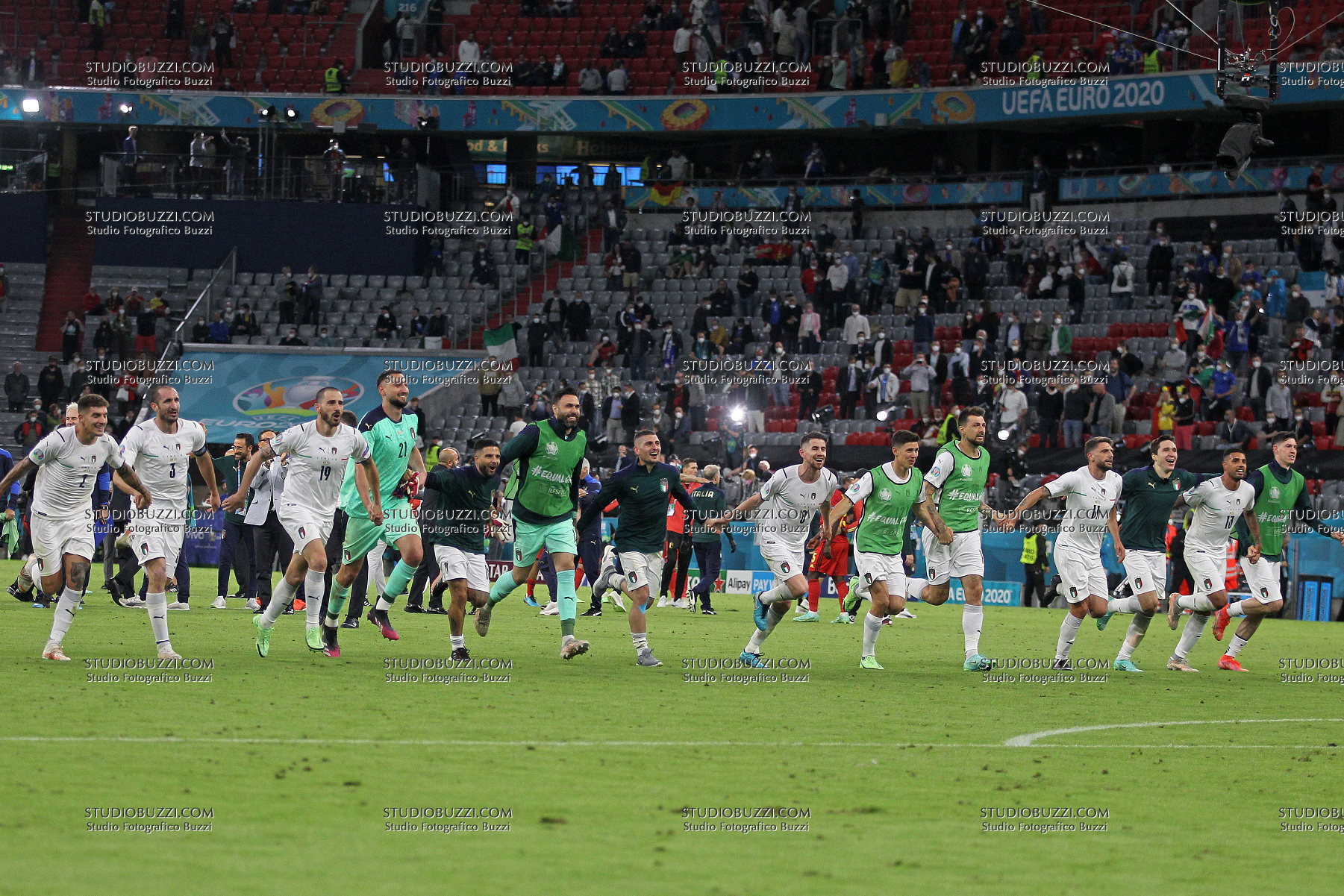 Evento: Euro 2020 quarti di finale belgio-italia 1-2; Argomento: Calcio; Periodo: 2020/21; Categoria: ITALIA; Soggetto: SQUADRA, GIOVANNI DI LORENZO, GIORGIO CHIELLINI, LEONARDO BONUCCI, GIANLUIGI DONNARUMMA, LORENZO INSIGNE, SALVATORE SIRIGU, MARCO VERRATTI, JORGINHO JORGE LUIZ FRELLO, MATTEO PESSINA, FRANCESCO ACERBI, DOMENICO BERARDI, FEDERICO CHIESA, EMERSON PALMIERI D; Nazione: Studio Buzzi; Descrizione: ESULTANZA; Luogo: STADIO; Città: MONACO DI BAVIERA;