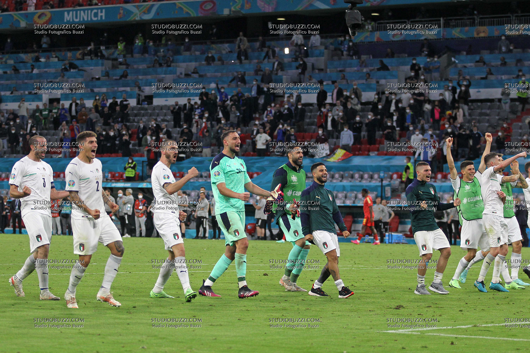 Evento: Euro 2020 quarti di finale belgio-italia 1-2; Argomento: Calcio; Periodo: 2020/21; Categoria: ITALIA; Soggetto: SQUADRA, GIOVANNI DI LORENZO, GIORGIO CHIELLINI, LEONARDO BONUCCI, GIANLUIGI DONNARUMMA, LORENZO INSIGNE, SALVATORE SIRIGU, MARCO VERRATTI, JORGINHO JORGE LUIZ FRELLO, MATTEO PESSINA, Italia, UEFA EURO 2020, Quarter Final, Belgium vs Italy 1-2, Munich; Nazione: Studio Buzzi; Descrizione: ESULTANZA; Luogo: STADIO; Città: MONACO DI BAVIERA;