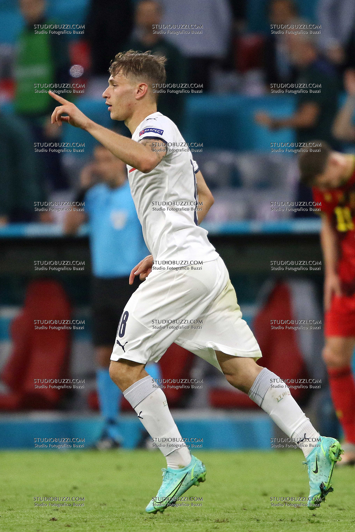 Evento: Euro 2020 quarti di finale belgio-italia 1-2; Argomento: Calcio; Periodo: 2020/21; Categoria: ITALIA; Soggetto: NICOLO BARELLA, Italia, UEFA EURO 2020, Quarter Final, Belgium vs Italy 1-2, Munich; Nazione: Studio Buzzi; Descrizione: ESULTANZA; Luogo: STADIO; Città: MONACO DI BAVIERA;