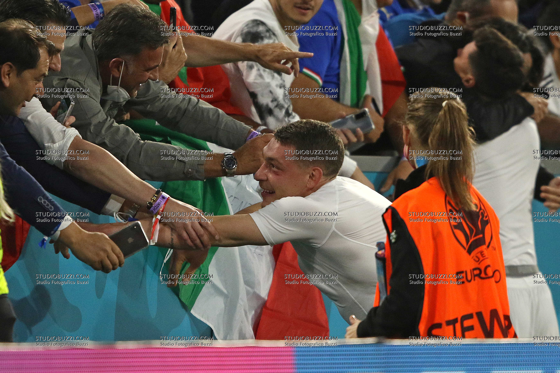 Evento: Euro 2020 quarti di finale belgio-italia 1-2; Argomento: Calcio; Periodo: 2020/21; Categoria: ITALIA; Soggetto: TIFOSI, ANDREA BELOTTI, Italia, UEFA EURO 2020, Quarter Final, Belgium vs Italy 1-2, Munich; Nazione: Studio Buzzi; Descrizione: ESULTANZA; Luogo: STADIO; Città: MONACO DI BAVIERA;