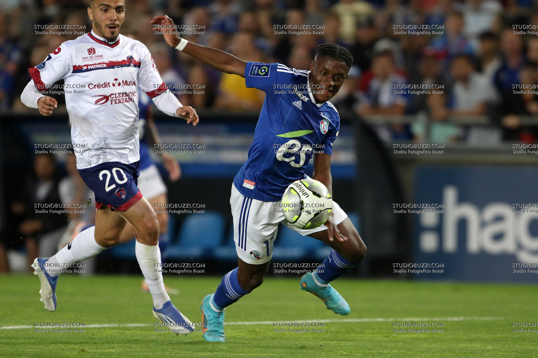 Evento: Ligue 1 2021-22 racing strasburgo-clermont foot 1-0 - maglia 202; Argomento: Calcio; Periodo: 2021/22; Categoria: RACING STRASBURGO STRASBOURG; Soggetto: JEANRICNER BELLEGARDE, Racing Strasburgo, Nuova Maglia, New shirt, kit, Stagione, Season, 2022-23, Ligue 1, Racing Strasbourg vs Clermont Foot 1-0, Strasbourg; Nazione: Studio Fotografico Buzzi Srl; Descrizione: AZIONE CONTRASTO; Luogo: STADIO; Città: STRASBURGO;