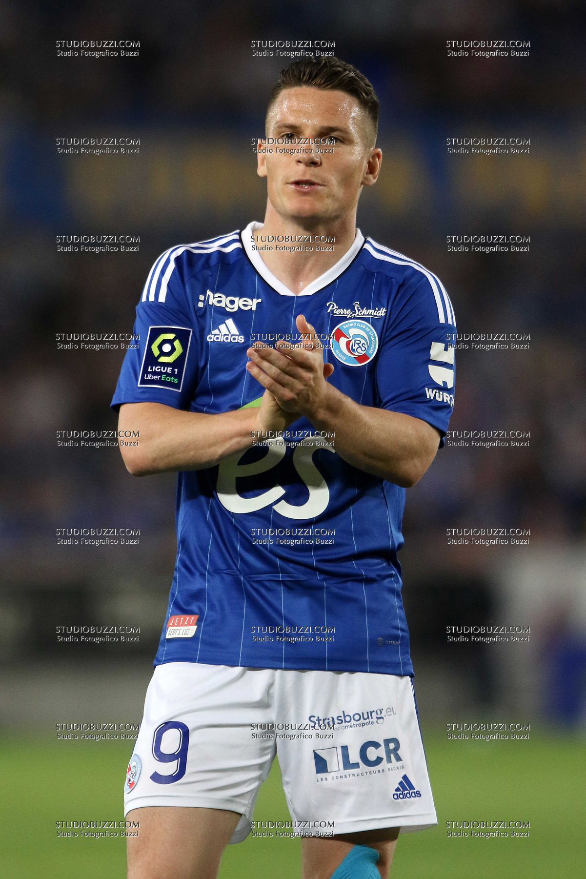 Evento: Ligue 1 2021-22 racing strasburgo-clermont foot 1-0 - maglia 202; Argomento: Calcio; Periodo: 2021/22; Categoria: RACING STRASBURGO STRASBOURG; Soggetto: KEVIN GAMEIRO, Racing Strasburgo, Nuova Maglia, New shirt, kit, Stagione, Season, 2022-23, Ligue 1, Racing Strasbourg vs Clermont Foot 1-0, Strasbourg; Nazione: Studio Fotografico Buzzi Srl; Descrizione: AZIONE PRIMO PIANO GESTI; Luogo: STADIO; Città: STRASBURGO;
