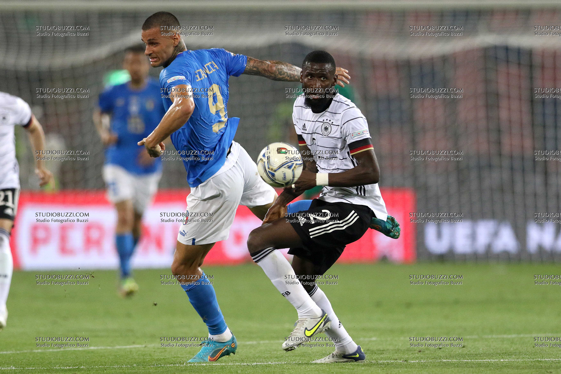 Evento: Uefa nations league 2023 italia-germania 1-1; Argomento: Calcio; Periodo: 2021/22; Categoria: ITALIA - GERMANIA; Soggetto: GIANLUCA SCAMACCA, Italia, ANTONIO RUDIGER, Germania, UEFA Nations League 2023, Finale, Italy vs Germany 1-1, Bologna; Nazione: Studio Buzzi; Descrizione: CONTRASTO; Luogo: STADIO; Città: BOLOGNA;