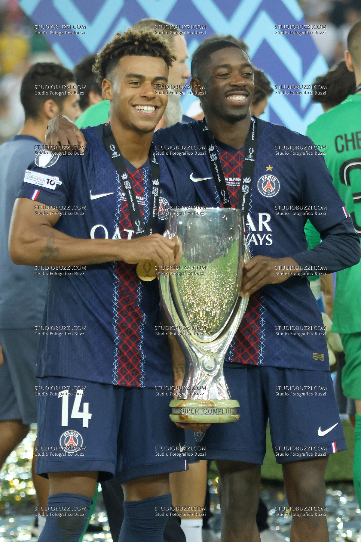 DESIRE DOUE, OUSMANE DEMBELE, PSG, UEFA Supercup Final 2025, Supercoppa, Paris Saint Germain vs Tottenham Hotspur 2-2 (4-3 apk), 13-08-2025, Esultanza, Celebration, Jubel, Con coppa, with Cup