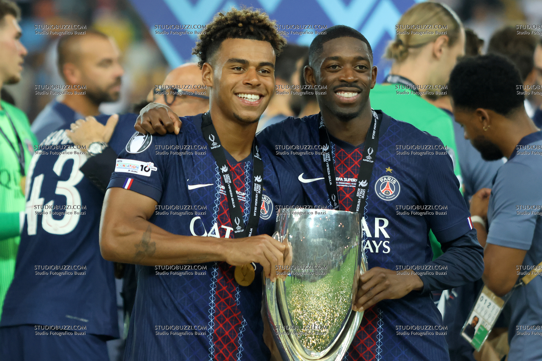 DESIRE DOUE, OUSMANE DEMBELE, PSG, UEFA Supercup Final 2025, Supercoppa, Paris Saint Germain vs Tottenham Hotspur 2-2 (4-3 apk), 13-08-2025, Esultanza, Celebration, Jubel, Con coppa, with Cup