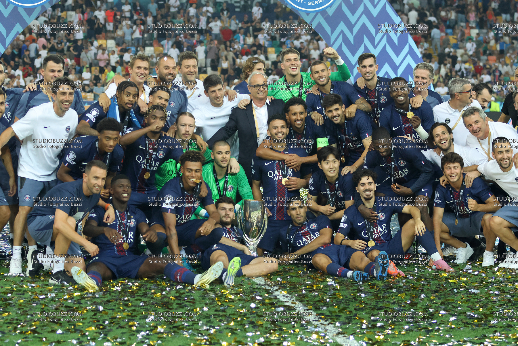 SQUADRA, Gruppo, Team group, PSG, UEFA Supercup Final 2025, Supercoppa, Paris Saint Germain vs Tottenham Hotspur 2-2 (4-3 apk), 13-08-2025, Esultanza, Celebration, Jubel, Con coppa, with Cup