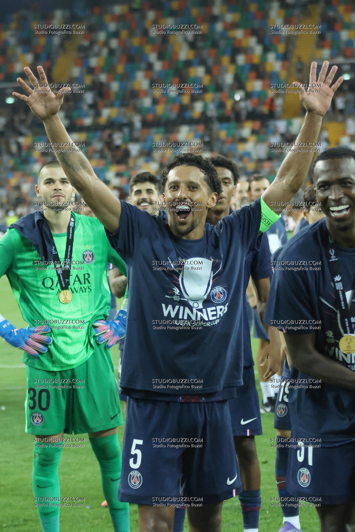 MARQUINHOS MARCOS AOAS CORREA, PSG, UEFA Supercup Final 2025, Supercoppa, Paris Saint Germain vs Tottenham Hotspur 2-2 (4-3 apk), 13-08-2025, Esultanza, Celebration, Jubel