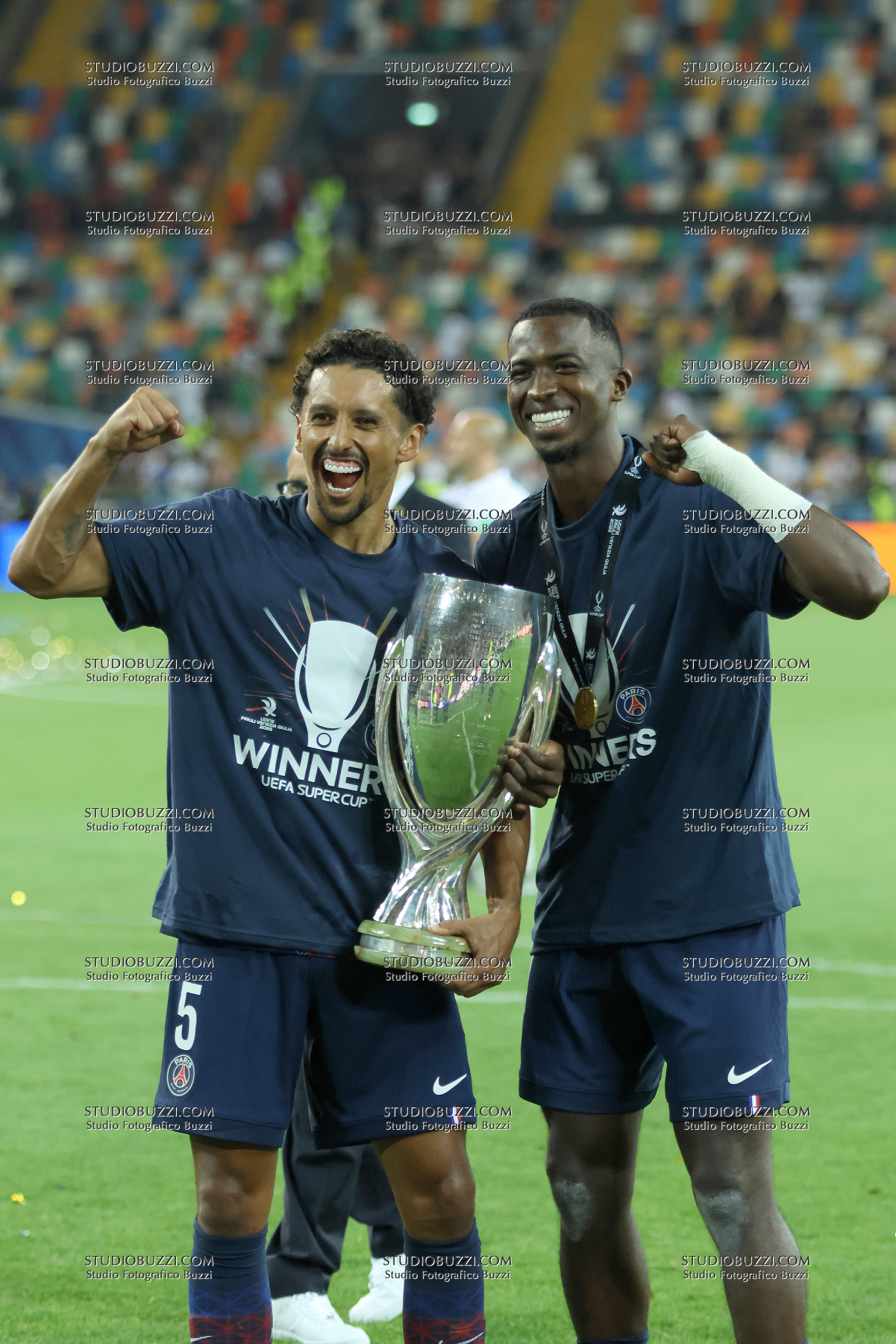 MARQUINHOS MARCOS AOAS CORREA, WILLIAN PACHO, PSG, UEFA Supercup Final 2025, Supercoppa, Paris Saint Germain vs Tottenham Hotspur 2-2 (4-3 apk), 13-08-2025, Esultanza, Celebration, Jubel, Con coppa, with Cup