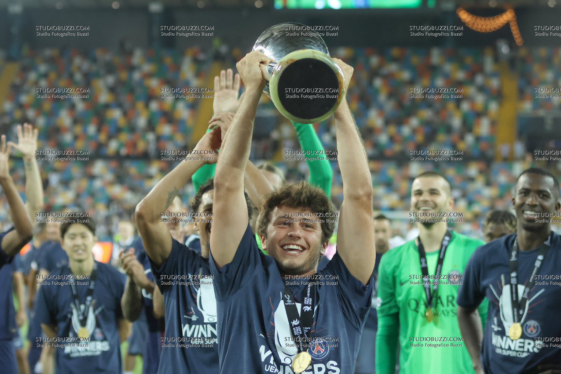 JOAO NEVES GONCALVES, PSG, UEFA Supercup Final 2025, Supercoppa, Paris Saint Germain vs Tottenham Hotspur 2-2 (4-3 apk), 13-08-2025, Esultanza, Celebration, Jubel, Con coppa, with Cup