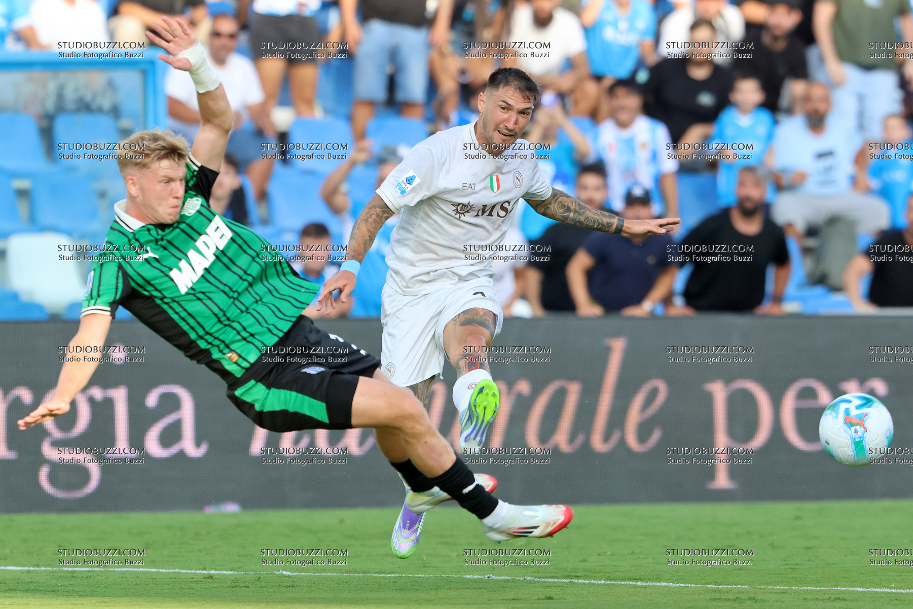 MATTEO POLITANO, Napoli, JOSH DOIG, Sassuolo, Serie A, 2025-26, Sassuolo vs Napoli 0-2, 23-08-2025, Contrasto, Action
