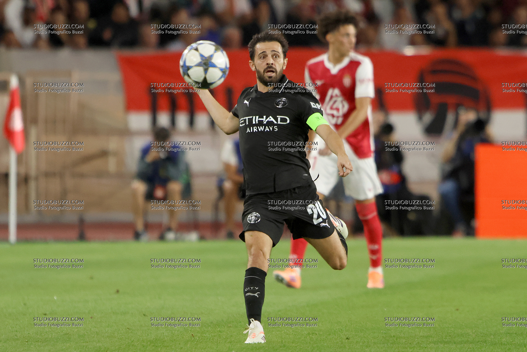BERNARDO SILVA, Manchester City, Champions League, 2025-26, Monaco vs Manchester City 2-2, 01-10-2025, Azione, Action, Contrasto