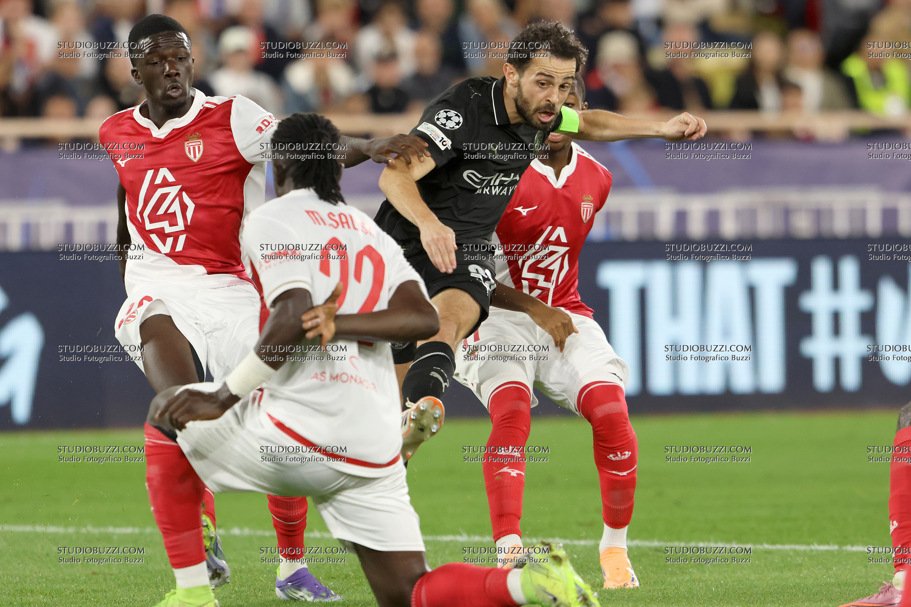 KASSOUM OUATTARA, Monaco, BERNARDO SILVA, Manchester City, Champions League, 2025-26, Monaco vs Manchester City 2-2, 01-10-2025, Contrasto, Action