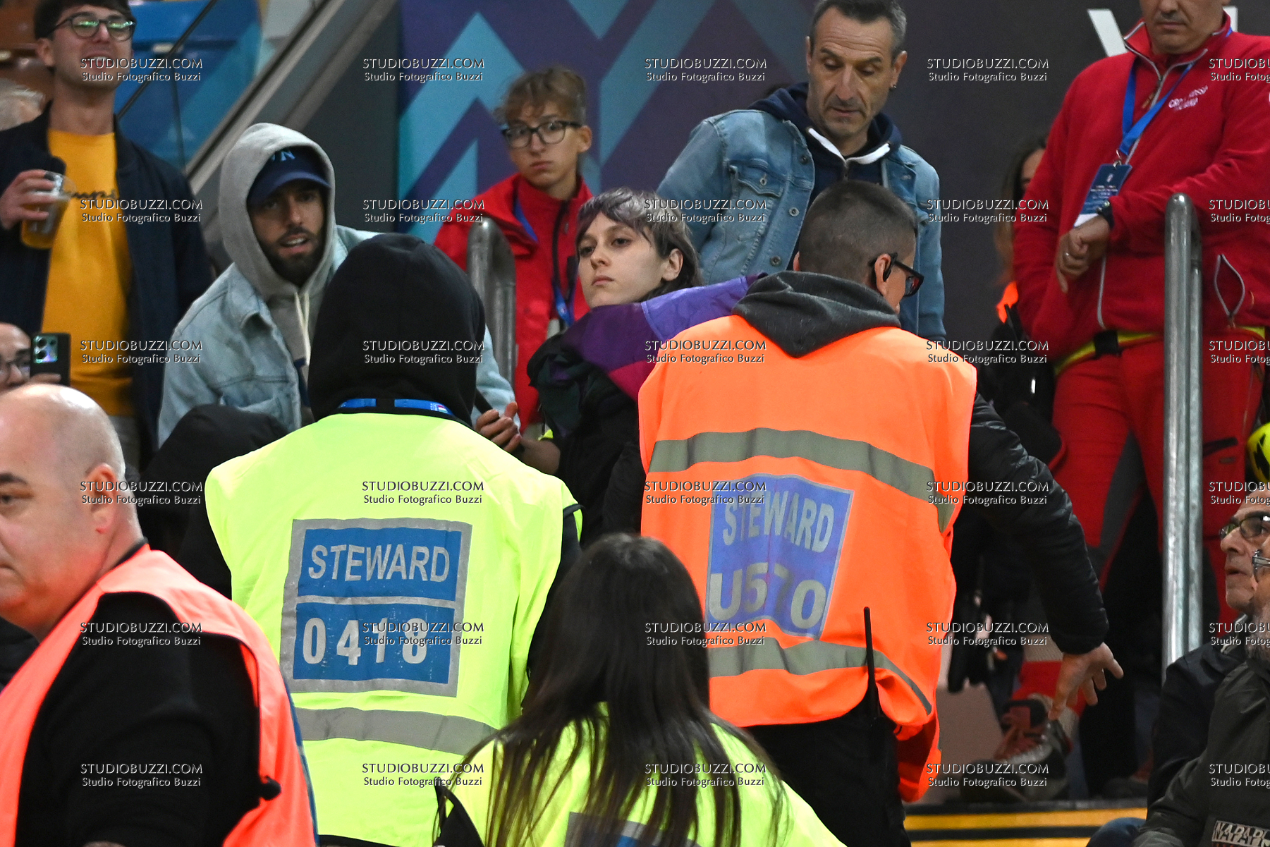 CONTESTATRICE ATTIVISTA PRO PALESTINA circondata da stewards in tribuna, STEWARDS SURROUND PRO PALESTINIAN ACTIVIST IN THE STANDS, World Cup Qualifying Round 2025-26, Italy-Israel 3-0