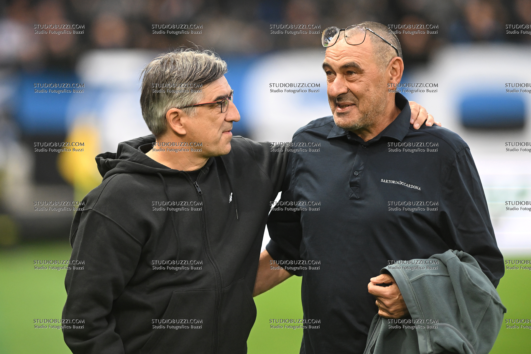 IVAN JURIC, Coach, Atalanta, MAURIZIO SARRI, Coach, Lazio, Serie A 2025-26, Atalanta-Lazio 0-0, azione, action, close up, gesti, abbraccio